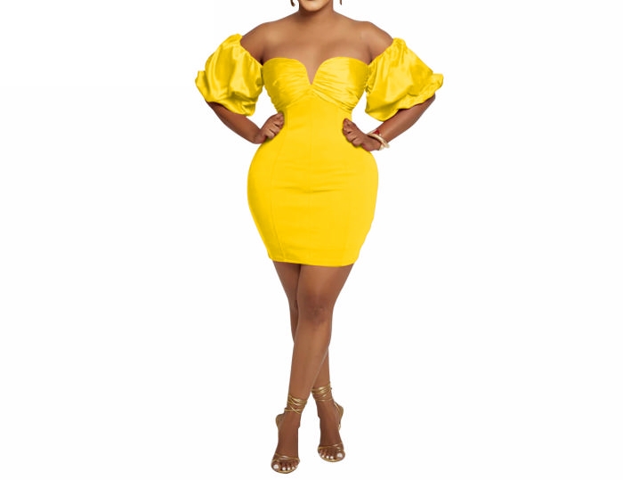 (Yellow)2023 Styles Women Sexy&Fashion Autumn/Winter TikTok&Instagram Styles Off Shoulder Short Sleeve Mini DressSKU: #XF73016-5