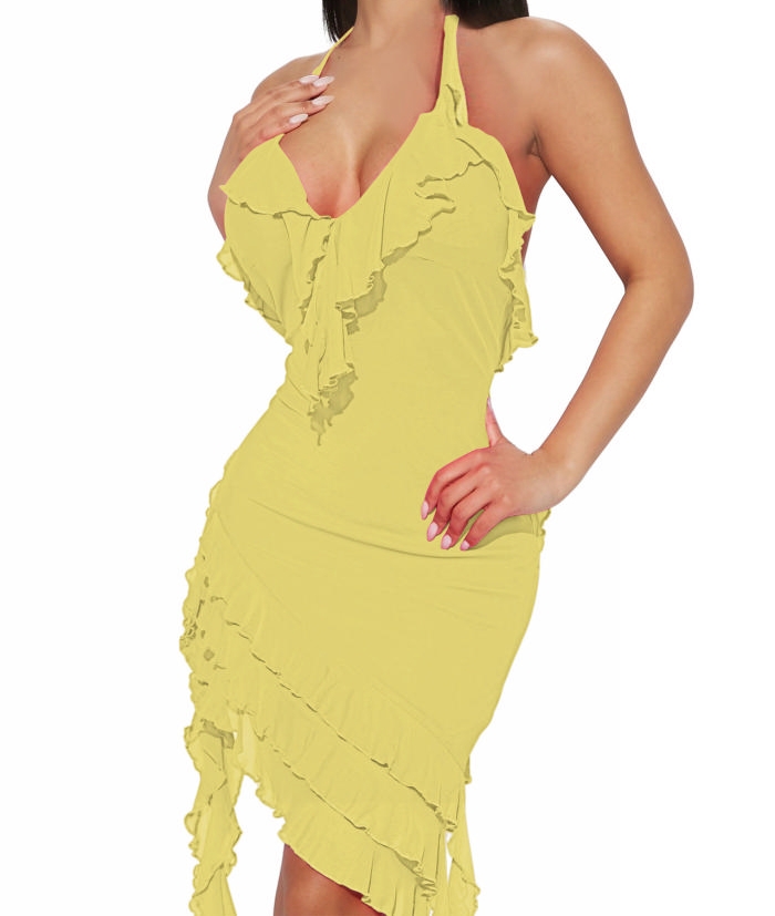(Yellow)2024 Styles Women Sexy&Fashion Sprint/Summer TikTok&Instagram Styles Halter Ruffle Irregular Mini DressSKU: #OU2895-7